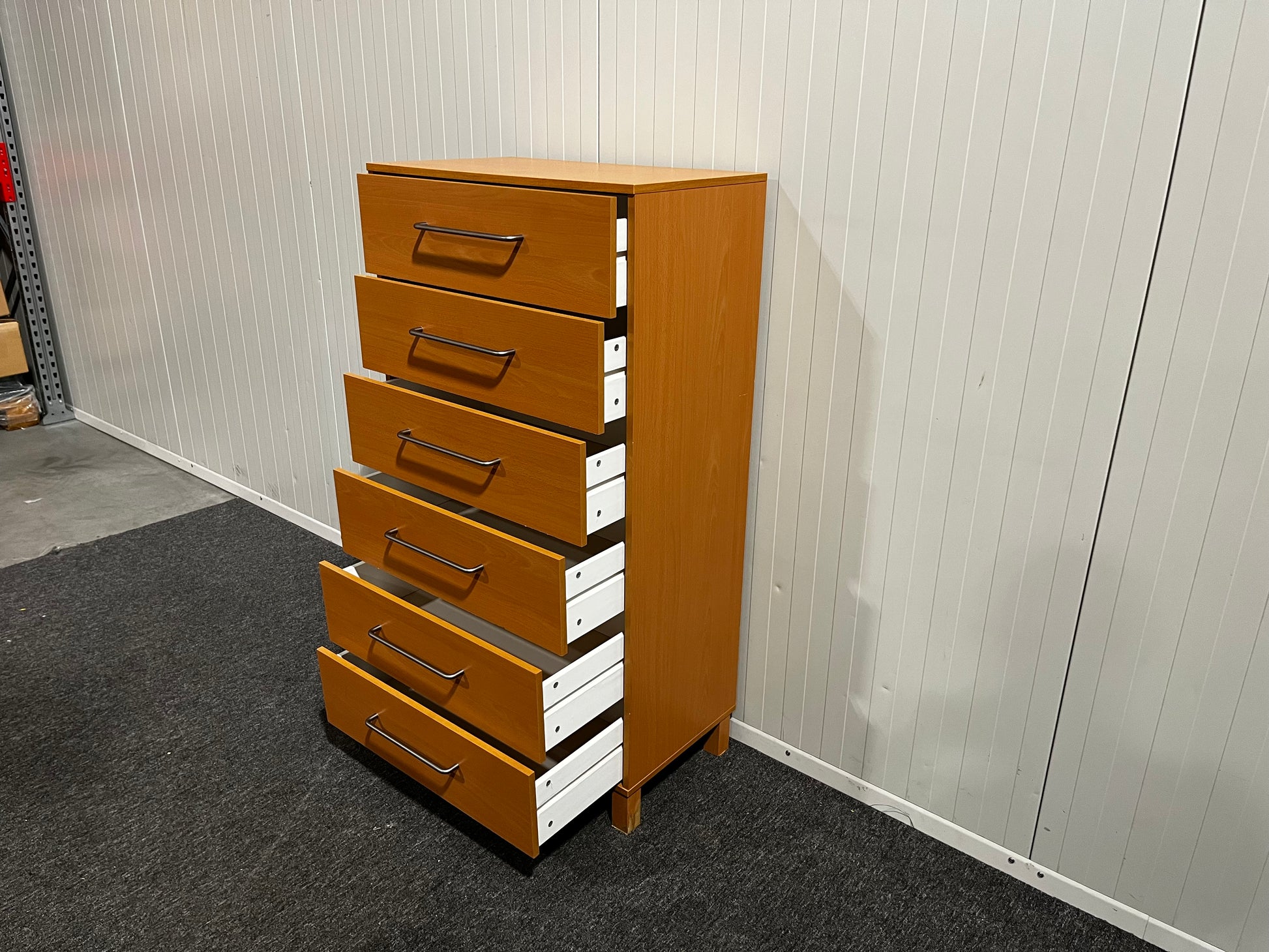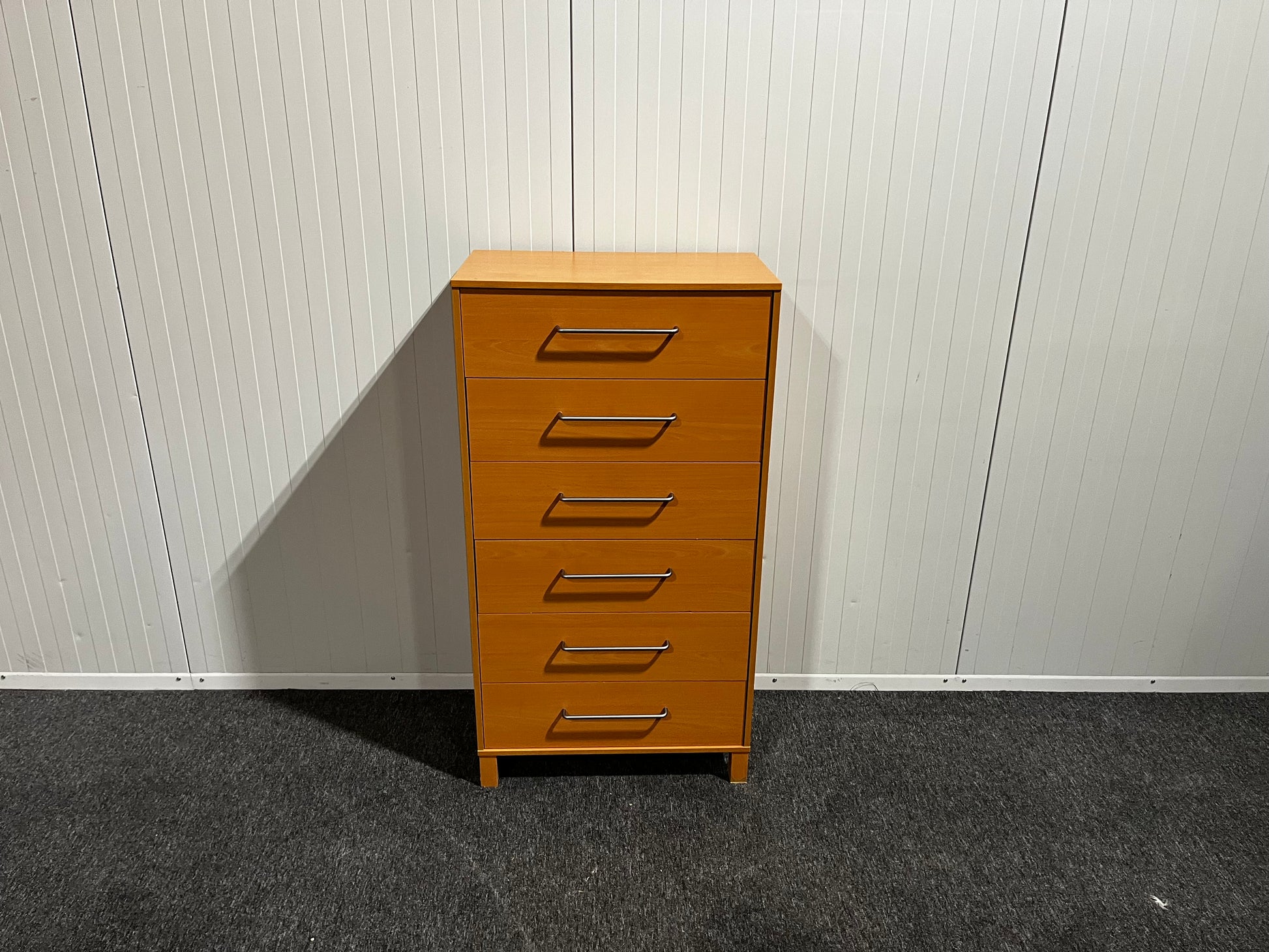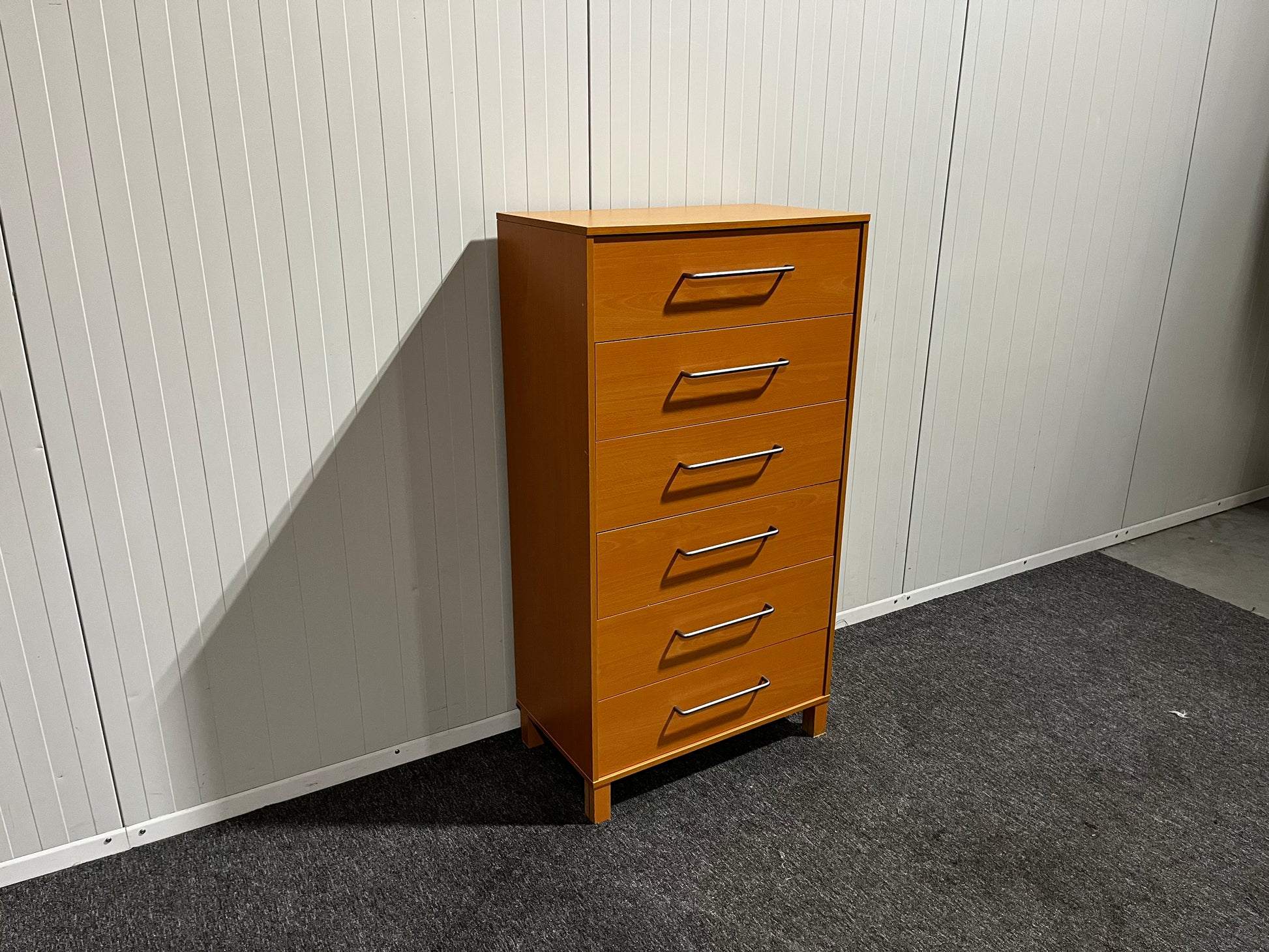 En praktisk och rymlig byrå med sex lådor som erbjuder mycket bra förvaring för kläder, textilier eller andra hushållsprylar. Den stilrena designen gör att den passar bra i sovrum, hall eller vardagsrum och lådorna glider lätt vid användning.